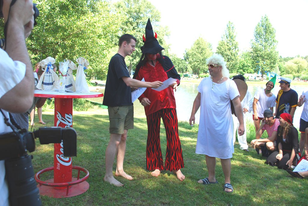 Engel Rainer Müller und Teufel Thomas Aust sind ebenso begeistert: "Eine wirklich erfrischende Idee", meinen sie lachend und beteuern, dass das nicht nur auf das kühle Nass an diesem heißen Sommertag bezogen sei. "Es bringt wirklich viel Spaß und ist viel sportlicher, als wir gedacht haben."
