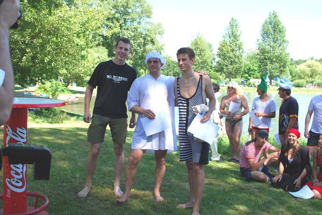 Jedoch: Was vorne gut rudert, schaufelt hinten viel Wasser in die Wanne - und das muss dann mitgeschleppt werden. "Wenn die Wanne leer ist, läuft sie wie die Hex, aber sobald sie voll ist, geht gar nichts mehr", erzählt Initiator Philipp Kritzler von seinen Erfahrungen. Er sitzt als sexy Pamela gemeinsam mit Manfred Starke als Team "Bay Watch" in der Wanne. Die beiden werden am Ende die zweiten Sieger sein.