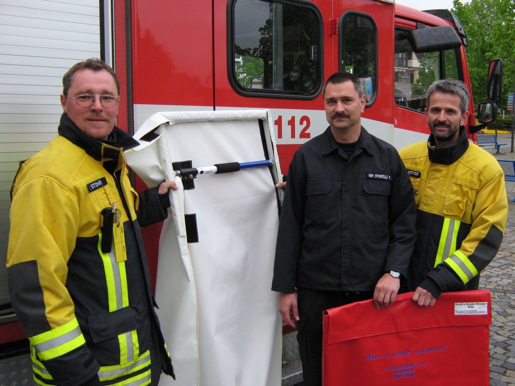 KBM Paul Sporrädle übergibt an die Kommandanten der Feuerwehr Wasserburg einen „Mobilen Rauchverschluss“. Dieser wurde im Rahmen eines Bayern weiten Projektes von der Versicherungskammer Bayern gesponsert.