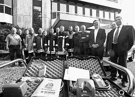 Der Geschäftsführer der Firma Schütz, die die Gasspürgeräte herstellte, Volker Heimburger (zweiter von rechts), unterwies die anwesenden Feuerwehrler gleich in der Handhabung der Geräte ein.