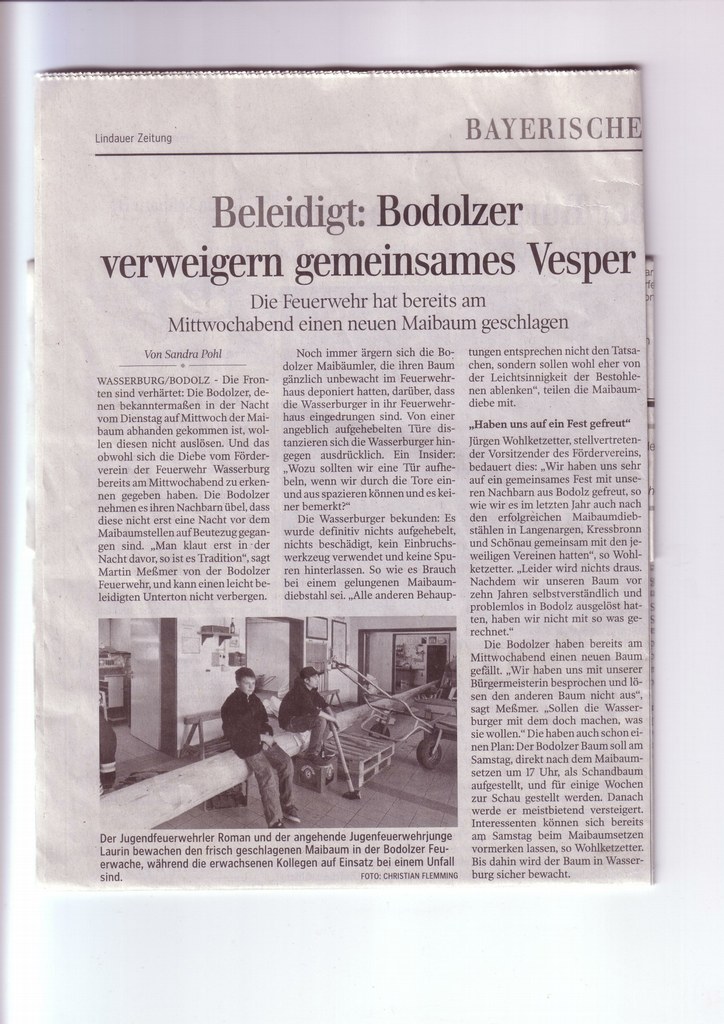 Die Bodolzer zeigen sich mittlerweile als schlechte Verlierer, haben sie doch anscheinend zwischenzeitlich bereits einen neuen Baum gefällt und diesen am Mittwoch Abend ins Feuerwehrhaus gebracht. In Wasserburg ist die Enttäuschung groß, hat man sich doch an die Maibaumregeln gehalten und beim erfolgreichen Diebstahl nichts beschädigt. Von einer angeblich aufgehebelten Türe wie die Bodolzer es am Donnerstag in der LZ behaupten distanzieren sich die Wasserburger ausdrücklich, ein Insider gibt einen kleinen Teil des Geheimnisses Preis "wozu sollten wir eine Tür aufhebeln wenn wir durch die Tore ein- und aus spazieren können und es keiner bemerkt?" Es wurde definitiv nichts aufgehebelt, nichts beschädigt, kein Einbruchswerkzeug verwendet und keine Spuren hinterlassen, so wie es Brauch ist bei einem gelungenen Maibaumdiebstahl. Alle anderen Behauptungen entsprechen nicht den Tatsachen sondern sollen wohl eher von der Leichtsinnigkeit der Bestohlenen ablenken. Der Diebstahl blieb bis Mittwoch mittag sogar unbemerkt.