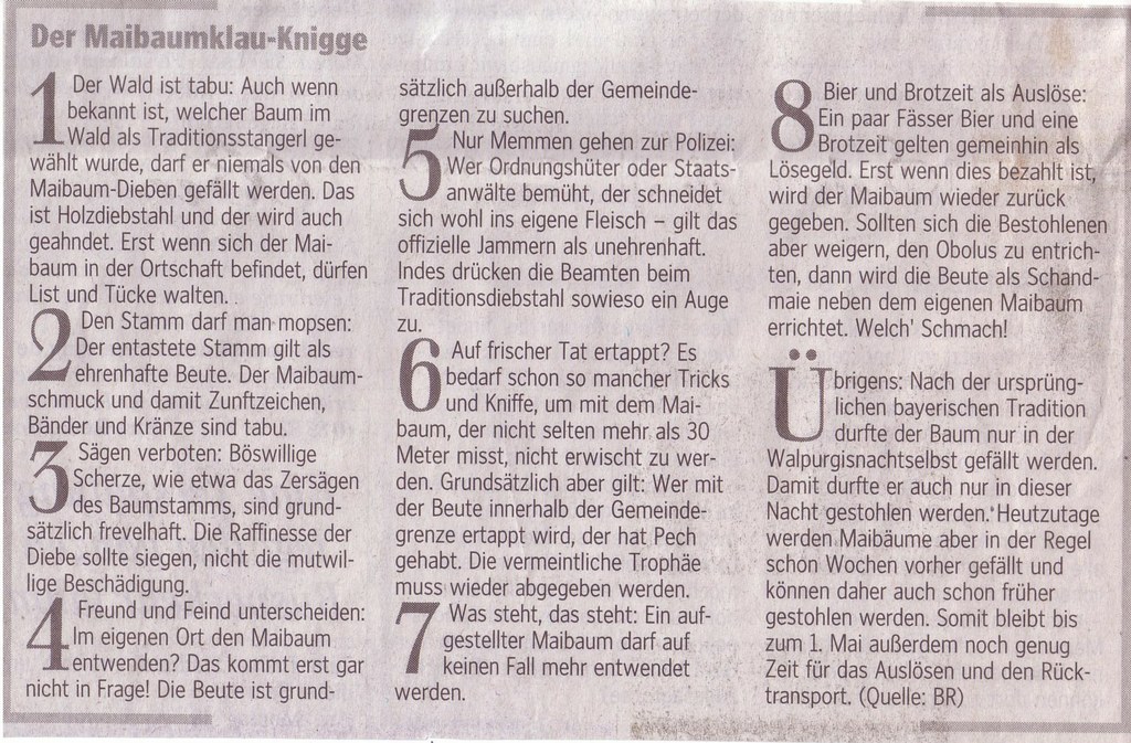 Am Mittwoch Abend fanden die Verhandlungen zwischen den Wasserburgern und Bodolzern in Sachen Maibaum statt. Wie berichtet hatten Mitglieder des Fördervereins der Wasserburger Feuerwehr in der Nacht von Dienstag auf Mittwoch den Bodolzer Baum aus dem dortigen Feuerwehrgerätehaus stibitzt. Die Wasserburger sehen diese aufwendige Aktion als Revanche an, hatten doch die Bodolzer den Wasserburger Baum vor 10 Jahren aus Wasserburg entführt und dafür auch Regelkonform eine stattliche Brotzeit bekommen.