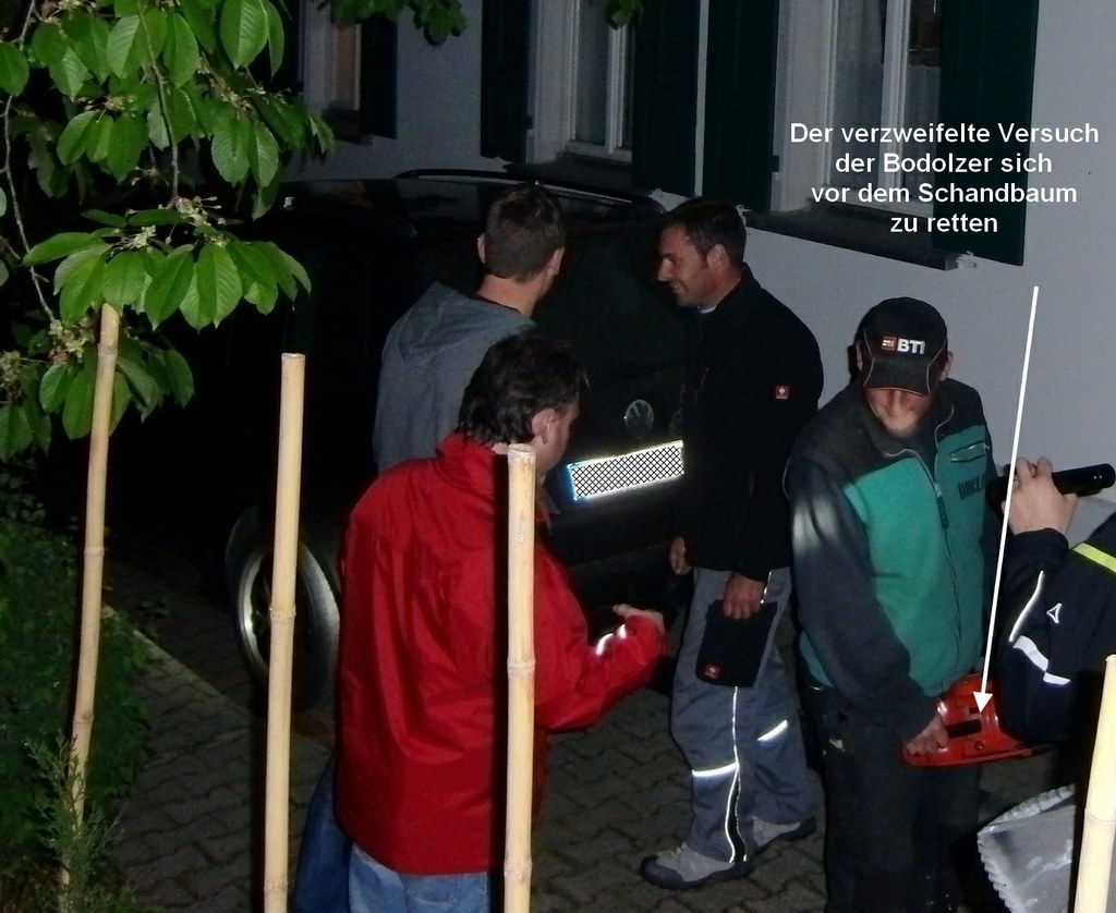 Als dann gegen später einige Bodolzer Maibäumler in Wasserburg auftauchten wurde Ihnen gerne von Wasserburger Seite ein Bier angeboten um gemeinsam noch ein wenig zu reden, eigentlich erschien bis hierin alles normal. Leider hatte genau diese Gruppe anderes im Schilde, und kurz danach machten sie sich mit einer Motorsäge am Bodolzer Schandbaum zu schaffen. Die Wasserburger Maibaumwache griff zwar sofort ein, was bei einer laufenden Motorsäge nicht ungefährlich ist, trotzdem war bereits ein ca. 7 cm tiefer Schnitt entstanden. Der Zerstörungsversuch wurde auch bildlich festgehalten (siehe Anlage).