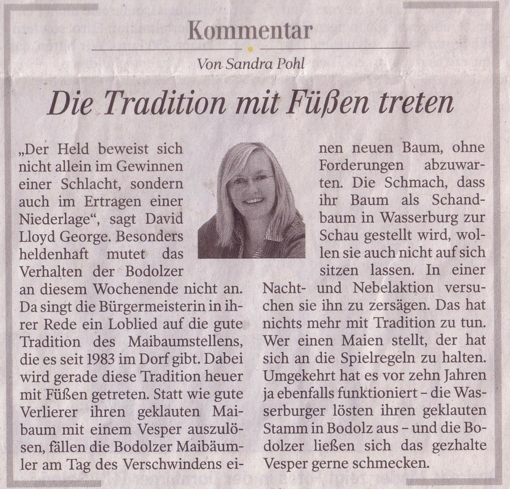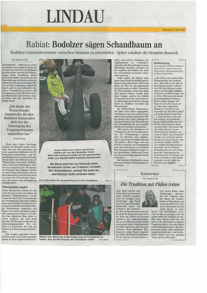 Am Freitagabend, ca. 21.30, nach 3 Tagen Zeit ab dem Maibaumdiebstahl erschienen in Wasserburg die Bodolzer Bürgermeisterin Sauter zusammen mit 2 Gemeinderäten. Sie bot den Wasserburger Maibäumlern an "den Baum nicht auszulösen, da man ja nichts auslöst das man nicht braucht, aber doch eine kleine Brotzeit zu bezahlen als eine Art Entsorgungspauschale für den nicht mehr benötigten Baum" (der sich seit Mittwoch in Wasserburger Hand befand). Die Wasserburger zeugten gegenüber diesen 3 Personen einen hohen Respekt, waren sie doch augenscheinlich bemüht eine weitere Eskalation der Angelegenheit zu vermeiden. Allerdings kam nach wie vor nur eine volle Auslöse in Frage, außerdem war es fragwürdig warum dieses Angebot erst nach 3 Tagen, nachts um kurz vor 22 Uhr erfolgt? Hatte die sachliche Berichterstattung der LZ vom Freitag mit den Maibaumklauregeln hier Wirkung gezeigt und man wollte von Seiten der Bodolzer Gemeinde Schadensbegrenzung betreiben?