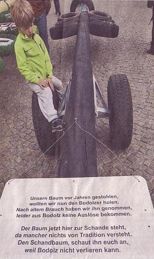 Am Samstag dann wurde in Wasserburg zuerst der traditionelle Maibaum gestellt, danach ginge es mit Begleitung des Wasserburger Musikvereins in die Bahnhofstraße, der "Trauerzug" folgte dem Baum, ein Gedicht wurde verlesen das ein Wasserburger Maibäumler verfasst hatte. Mit Trauermusik wurde der Schandbaum unter großer Anteilnahme der Wasserburger Bevölkerung gesetzt, aber auch einige Bodolzer wurden auf dem Fest gesehen.