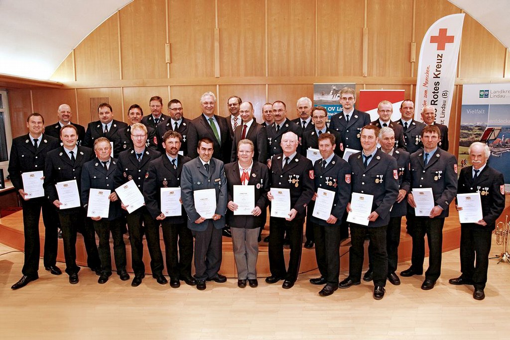 Angesichts dieser Leistungsbereitschaft sei es für den Freistaat selbstverständlich, mit Zuschüssen für eine gute Ausstattung zu sorgen. Herrmann zählte verschiedene Fahrzeuge auf, die Retter im Landkreis nutzen und für die es Fördergeld gegeben habe. Auch den Bau der neuen Feuerwache in Lindau fördere das Land. Außerdem danke Bayern nicht nur Feuerwehrlern, die seit 25 oder gar seit 40 Jahren aktiv sind, mit staatlichen Ehrungen, sondern zeichne auch Rotkreuzler oder THWler entsprechend aus. Erhielten die treuen Retter diese Auszeichnungen früher bei den Hauptversammlungen, so möchte Landrat Elmar Stegmann die Retter künftig beim jährlichen Blaulichtempfang ehren. Die Geehrten genossen es, einmal im Mittelpunkt zu stehen – und freuten sich nach dem offiziellen Teil auf Speisen und Getränke und ein zwangloses Miteinander. Die Bläsergruppe Lindau hat den Abend übrigens musikalisch umrahmt.