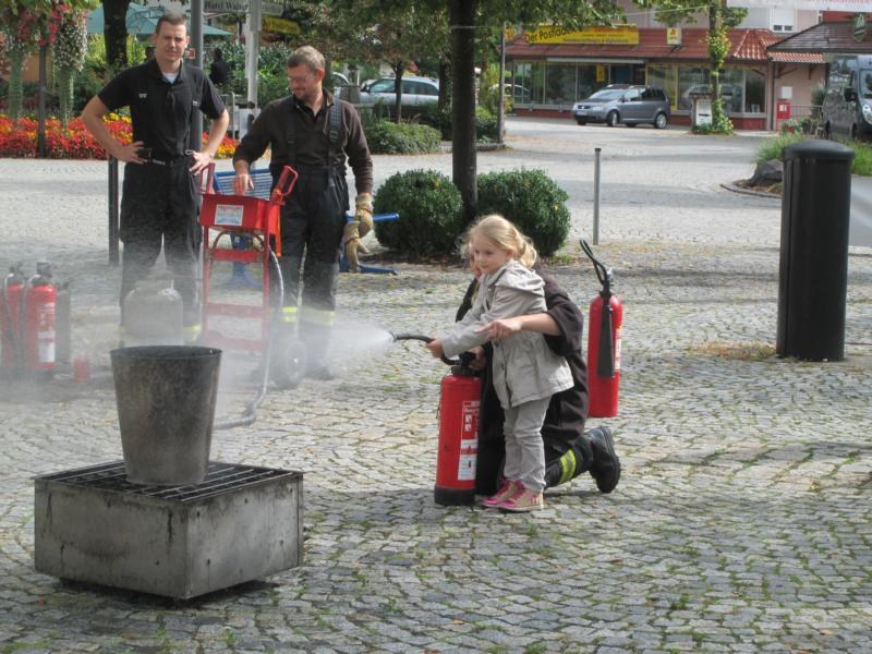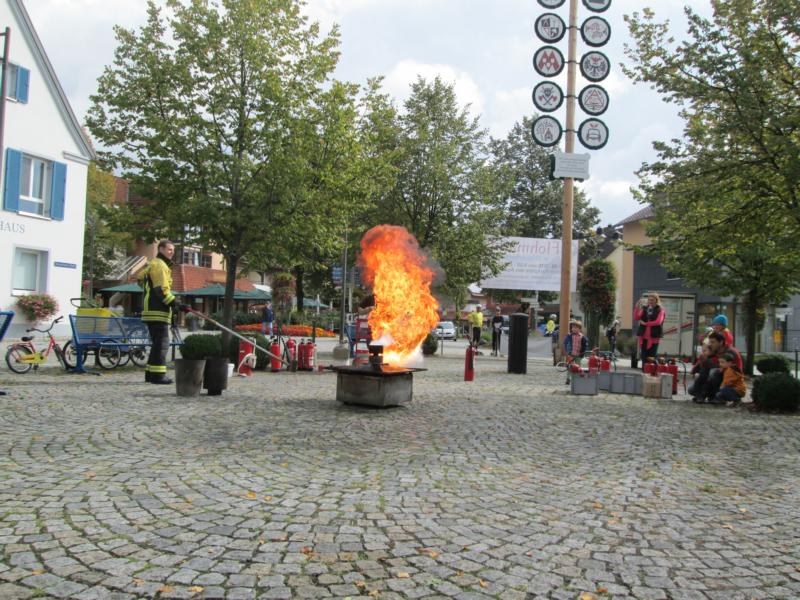 Sicherung lösen, mit dem Griff aktivieren und den Schlauch auf das Feuer richten – so kinderleicht ist die Bedienung eines Feuerlöschers. Das durften in Wasserburg auch schon die Kleinsten ausprobieren. „Mit dem Feuerlöschertrainer, der eine Gasflamme erzeugt, könne wir hier unter ganz kontrollierten Bedingungen vorführen, wie ein Feuerlöscher funktioniert. Da können auch schon kleine Kinder mitmachen", erklärt Dominik Traenkle, Gruppenführer bei der Freiwilligen Feuerwehr Wasserburg. Und die sind mit großem Interesse dabei. Aber auch Erwachsene tun gut daran, für den Ernstfall zu üben. „Ziel ist, dass die Leute sich überhaupt trauen, zum Feuerlöscher zu greifen", so Traenkle. Wichtig ist dabei auch der Eigenschutz: Gerade beginnende, kleine Brände kann man gut selbst mit dem Feuerlöscher bekämpfen, größere sollte man der Feuerwehr überlassen – und diese sollte immer zur Nachkontrolle kommen, auch wenn alles gelöscht ist.