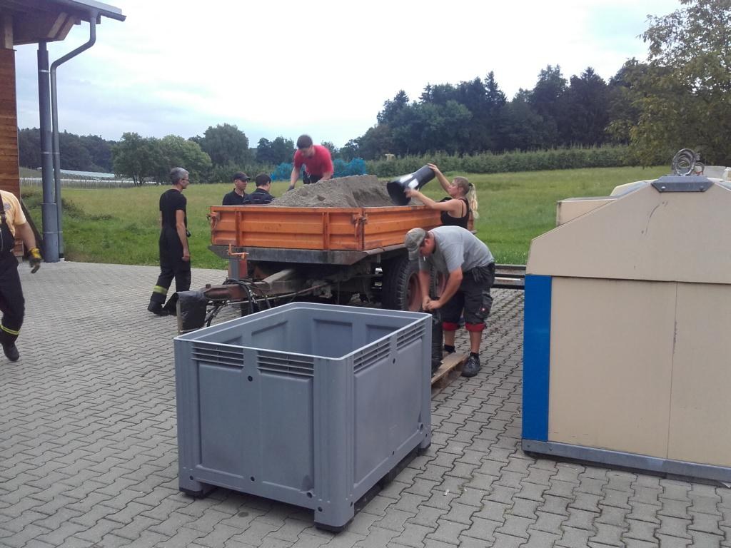 Die Feuerwehren Hege und Wasserburg haben am 29.08. 2016 die vorhandenen Notfall-Füllmöglichkeiten auf Tauglichkeit getestet, um im Falle eines Falles, wenn keine gefüllten Säcke gekauft werden können oder die Zeit dazu nicht reicht, gerüstet und vorbereitet zu sein. Hierzu wurden Trichter, Füllrohre und spezielle Füllschaufeln getestet und auf Tauglichkeit überprüft.