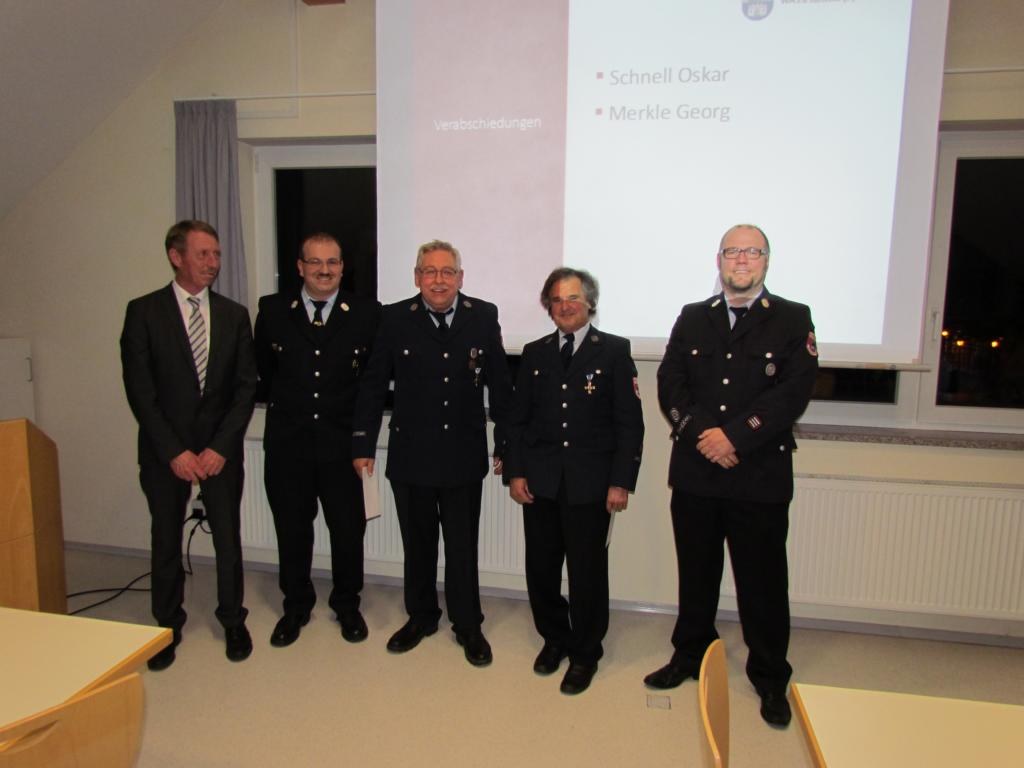 Bild: Von links stellv. Bürgermeister Alexander Fundele, Kommandant Christian Schorer, Georg Merkle, Oskar Schnell, stell. Kommandant Christian Ergenschäfter