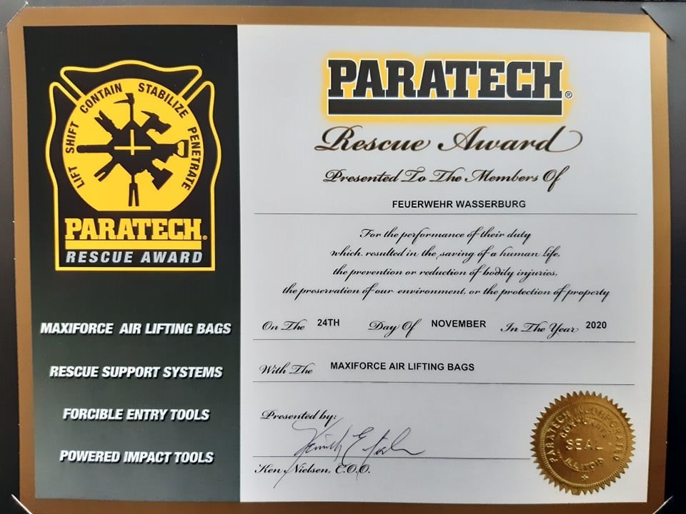 Am 9.2.2021 haben wir Post aus den USA erhalten. Die Firma Paratech, die Rettungsgeräte herstellt und von der wir unsere Hebekissen haben, hat uns einen Rescue Award verliehen.