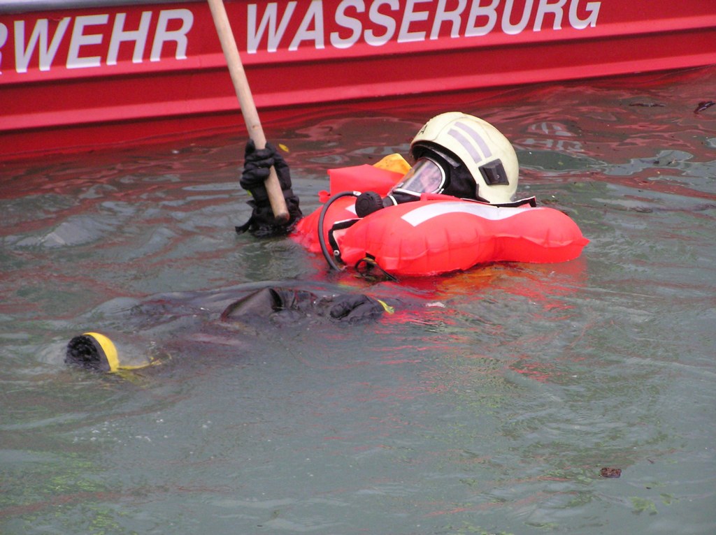 - Uns ist durchaus bewusst, dass Atemschutzgeräte bzw. die Atemschutzmasken keine Taucherausrüstung ist. Dies bezwecken wir auch nicht. Diese Übung erfolgte einzig und allein um Erfahrung zu sammeln, was passiert wenn ein Atemschutztrupp in kompletter Ausrüstung ins Wasser fällt.