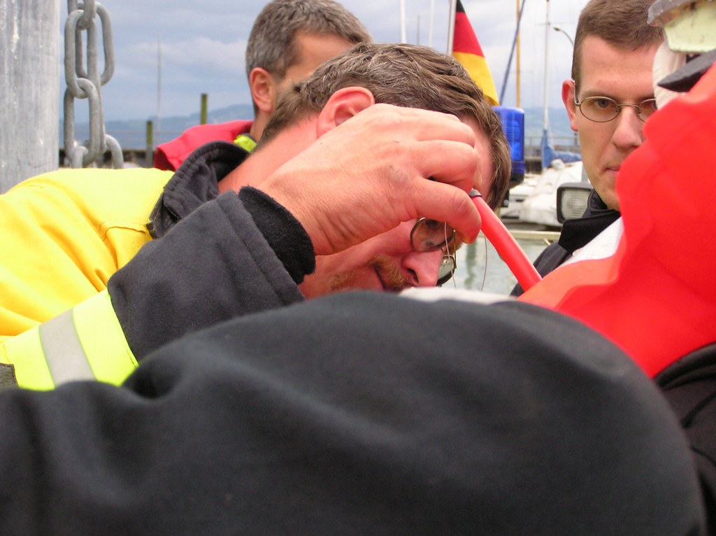 - Das an Bord nehmen eines Kameraden aus dem Wasser gelang nur über die am Heck angebrachte Leiter. Über die Rehling war dies, mit der kompletten PSA, ein unmögliches Unterfangen.