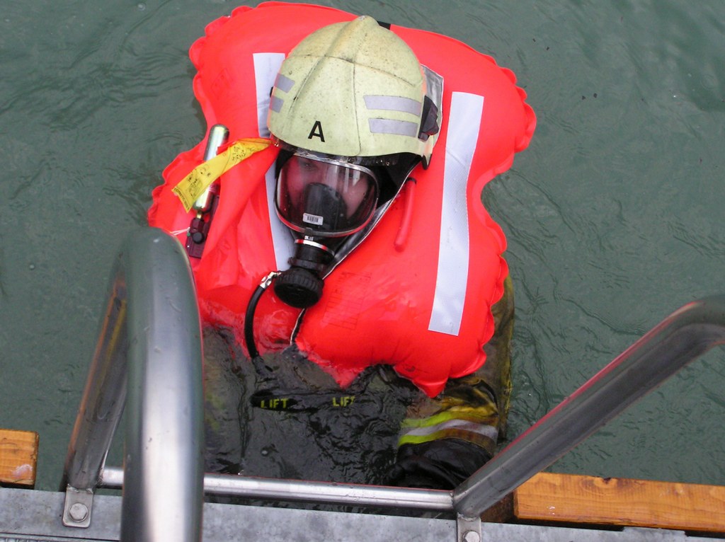 - unsere automatischen Rettungswesten sich in sekundenschnelle aufblasen. Unabhängig davon, ob ein Atemschutzgerät angelegt ist oder nicht.