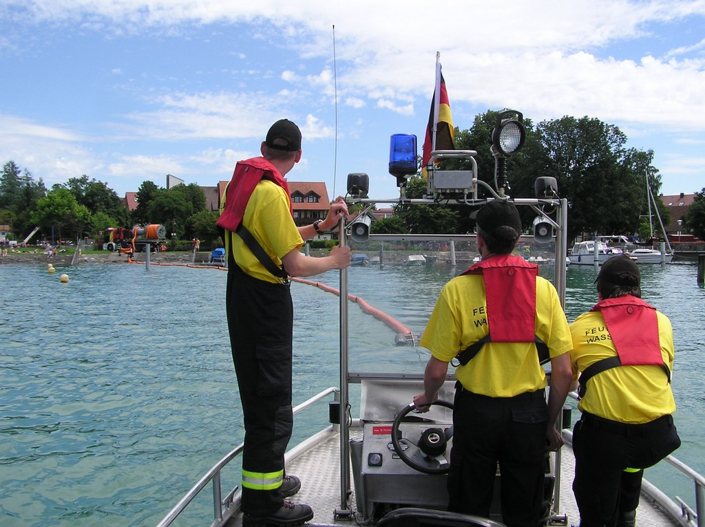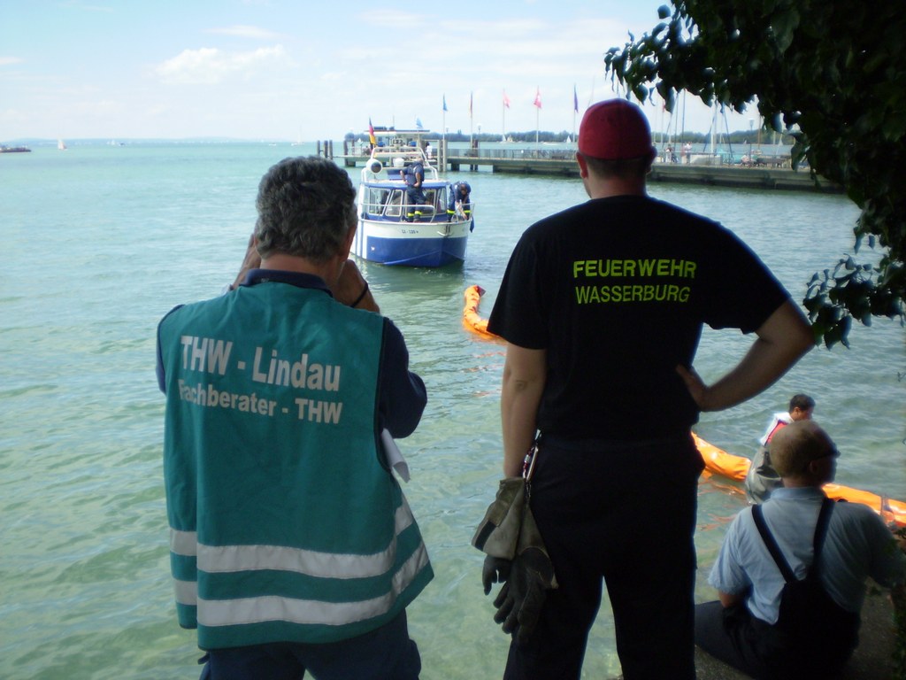 Alle Beteiligten wissen, es ist eine Übung, die Stimmung ist ausgelassen, doch die rund 90 freiwilligen Helfer haben alle Hände voll zu tun. Um 13 Uhr ist Übungsbeginn, die Boote stehen bereit, und die Helfer an Land machen sich für den Einsatz startklar. An der Ölwehrübung sind die Kräfte der Feuerwehr und des Technischen Hilfswerks aus Lindau sowie die Feuerwehren aus Wasserburg, Nonnenhorn, Friedrichshafen und Überlingen beteiligt.