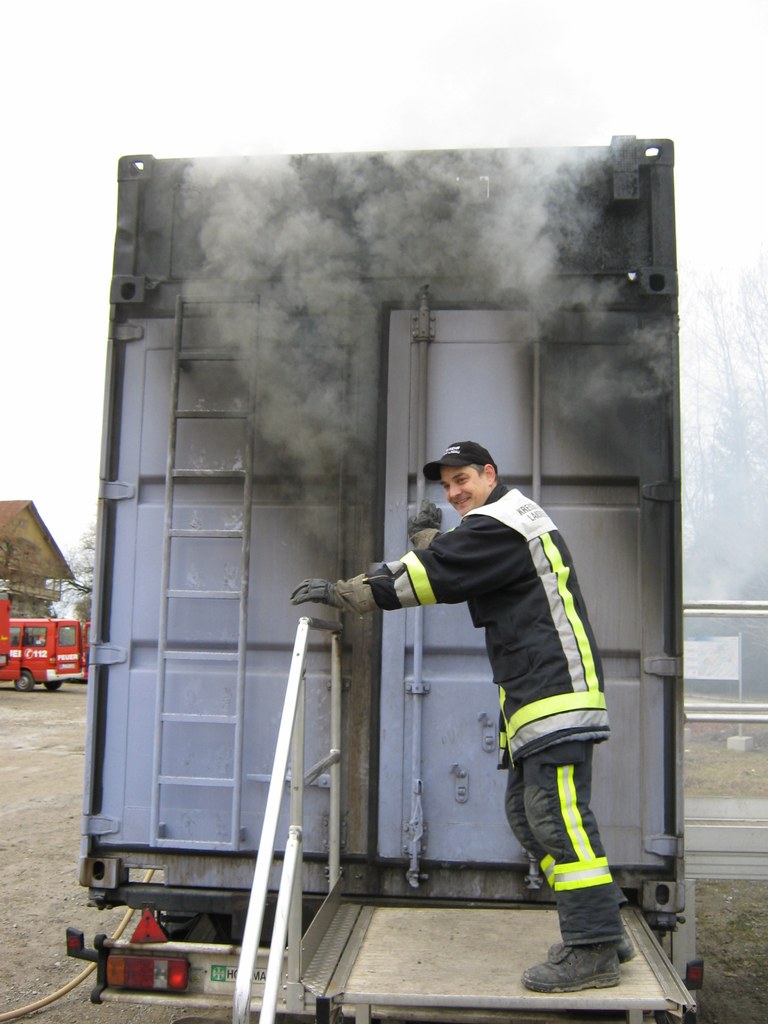 Wie bereits im Dezember 2007 war es in der letzten Novemberwoche 2009 wieder soweit: Der holzbefeuerte Brandübungscontainer der Versicherungskammer Bayern machte wieder in Lindenberg Station und 1 Frau und 1 Mann aus Wasserburg durften am 27.11.2009 dort den Theorievortrag genießen und danach einen Durchgang im Container absolvieren.
