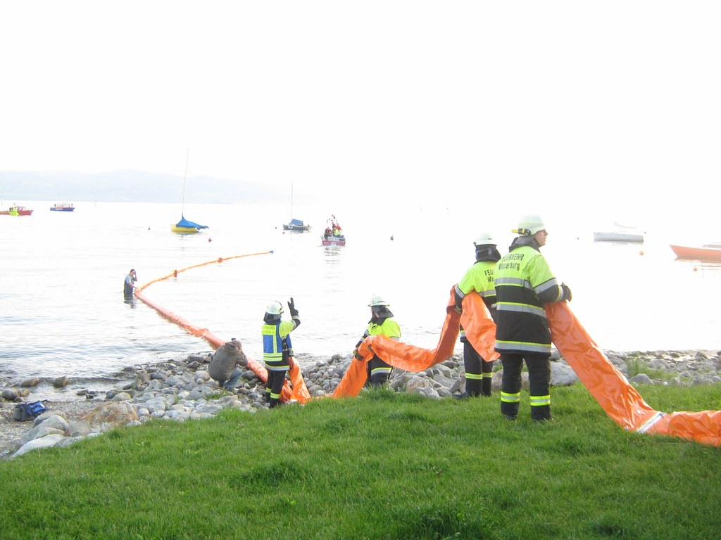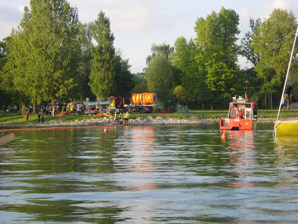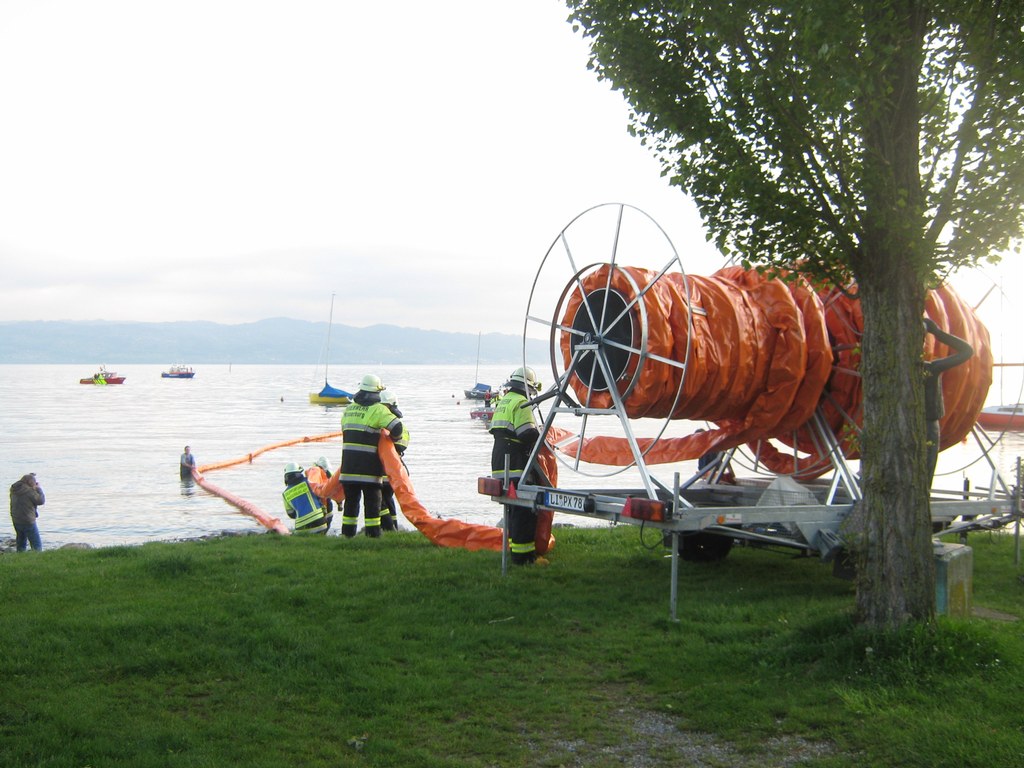 Insgesamt wurden in einem Zeitraum von eineinhalb Stunden unter der Leitung von Kreisbrandmeister Paul Sporrädle 800 Meter Schwimmsperren von den Einsatzkräften in den Bodensee und drei Festlandsperren in den Eschbach eingebracht.