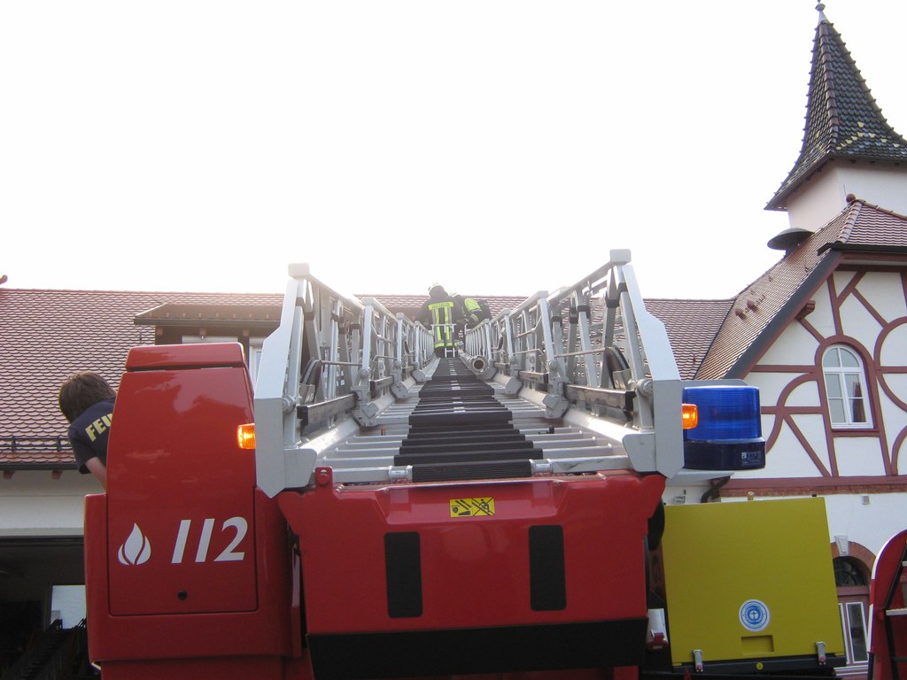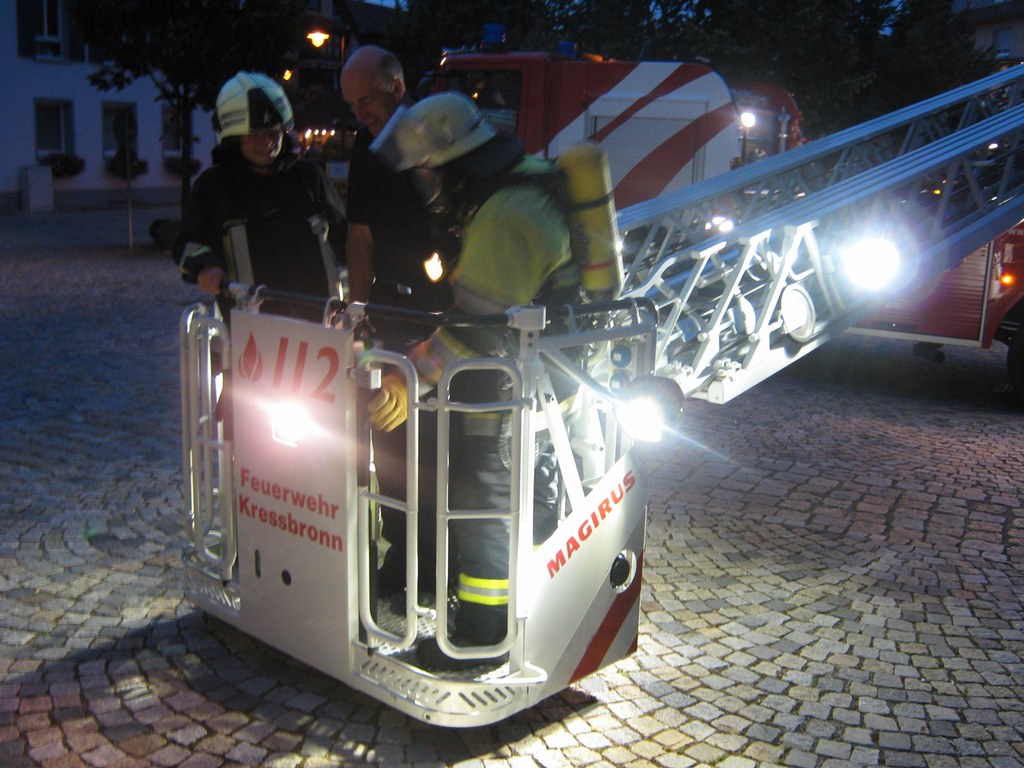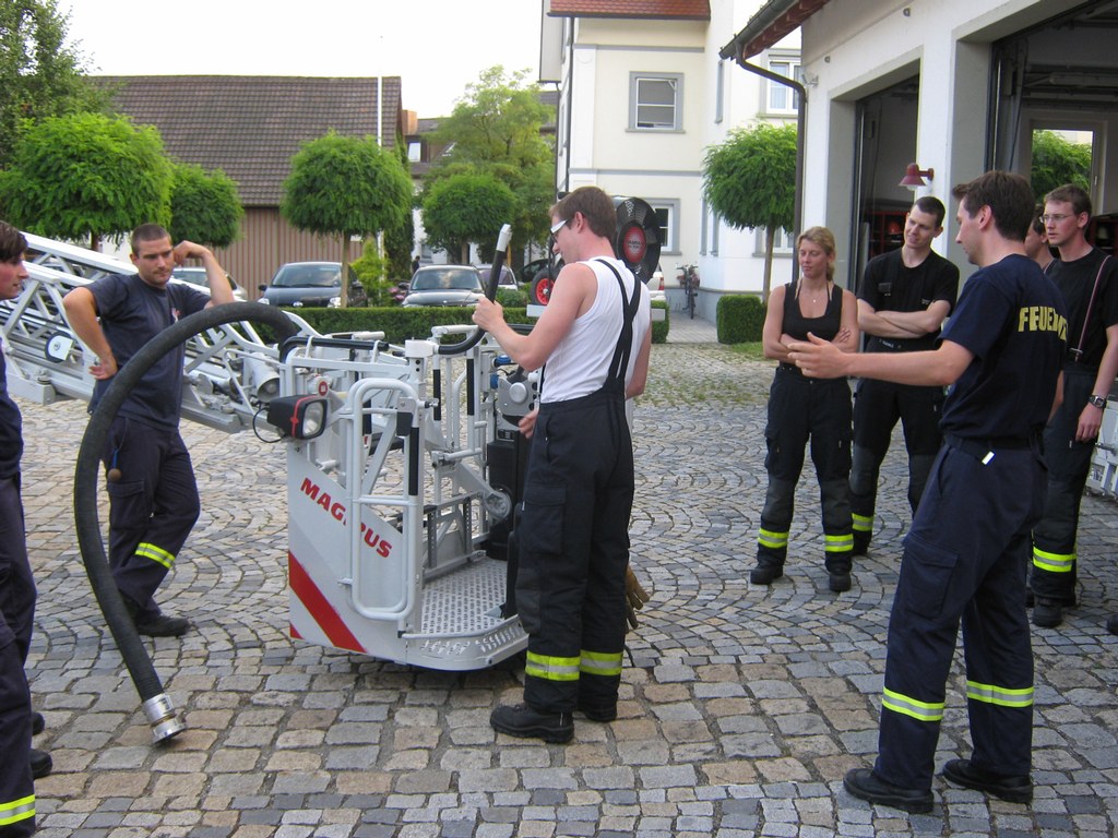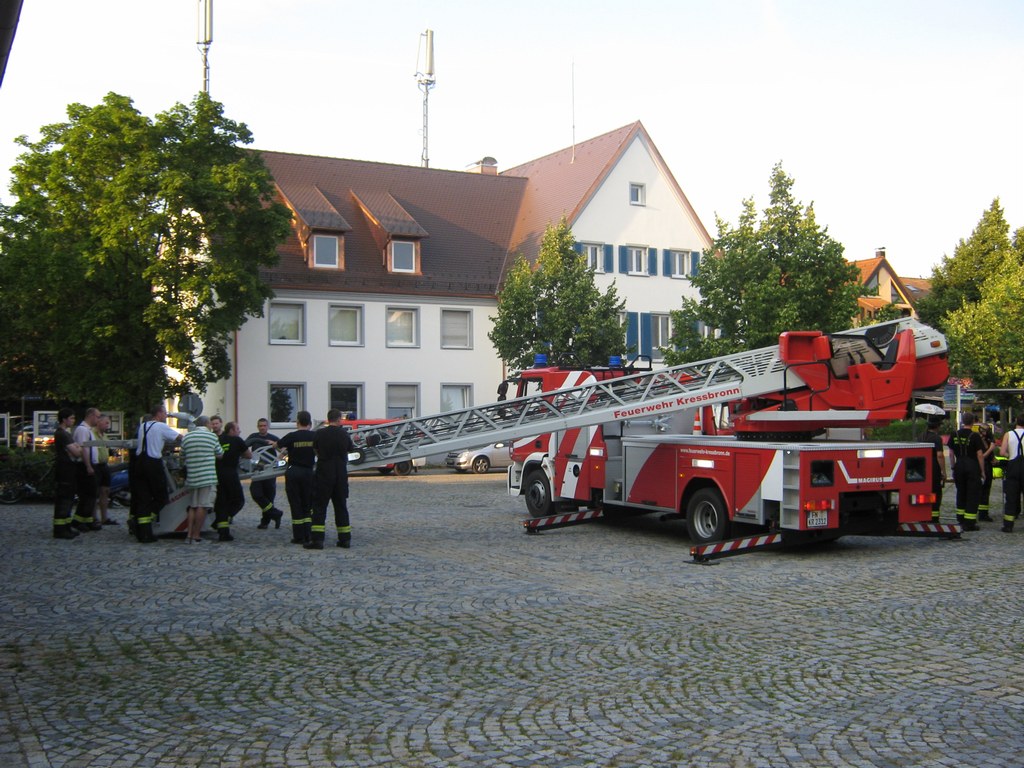Die Feuerwehr Lindau mit dem Abrollbehälter Atemschutz und die Feuerwehr Kressbronn mit ihrer DL(A)K 23-12 waren ebenfalls in Wasserburg. Zu Beginn der Übung wurde von den Kameraden aus Lindau der AB-A vorgestellt und auch die dort verlasteten Überdruckgeräte kurz erklärt. Die Kameraden aus Kressbronn erklärten die fast neue Drehleiter. Anschließend wurde truppweise eine Stationsausbildung unter Preßluftatmer absolviert, dies wurde von allen Kameraden trotz heißer Temperaturen mit großem Engagement durchgeführt. Hierbei wurde auch die Kressbronner Drehleiter mit einbezogen und mit jedem Trupp mehrmals benutzt.