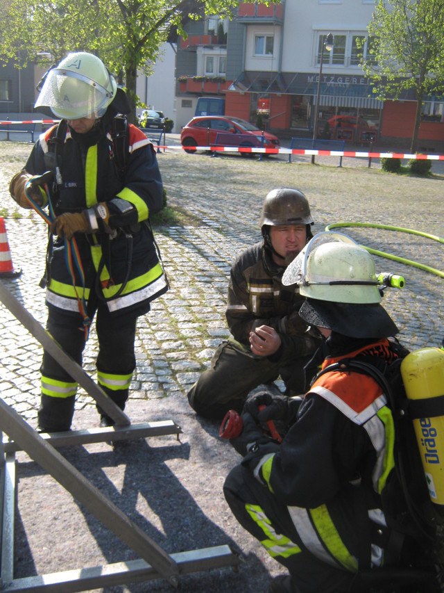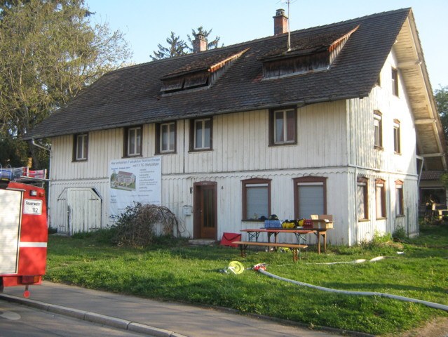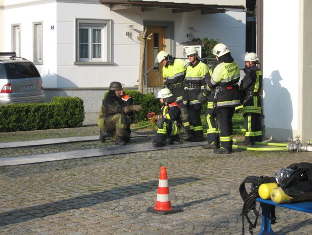 In einem der Feuerwehr Wasserburg für dieses Wochenende zur Verfügung gestellten Abbruchhaus, wofür wir uns bei den Eigentümern auch herzlich bedanken, stellten dann Volker Schmidt (Feuerwehr Illingen + Team Atemschutzunfälle) und Hans Fuhrer (Feuerwehr Aeschi / Schweiz + Team brandcontainer.ch) das gesammelte Wissen der Atemschutzgeräteträger auf die Probe. Im unteren Stock wurden die Räume realistisch vernebelt und einige Personen (Puppen) waren abgängig, diese mußten möglichst schnell gefunden und gerettet werden. Hierfür standen auch alle möglichen Hilfsmittel wie Rauchvorhang, Wärmebildkameras, Überdrucklüfter, Leinen und Schlauch zur Verfügung und wurden unter den kritischen Augen von Hans eingesetzt. Hierbei zählten vor allem Teamwork und schnelles aber durchdachtes Vorgehen. Im ersten Stock und den Treppen wurden verschieden Schlauchtechniken ausprobiert und auch für uns neue Dinge wie Schlauchpaket getestet und ausprobiert. Diese Erfahrungen waren für uns besonders wertvoll.