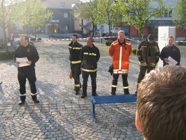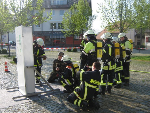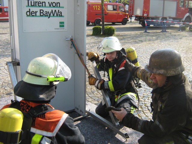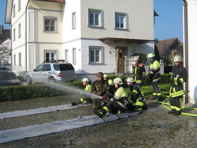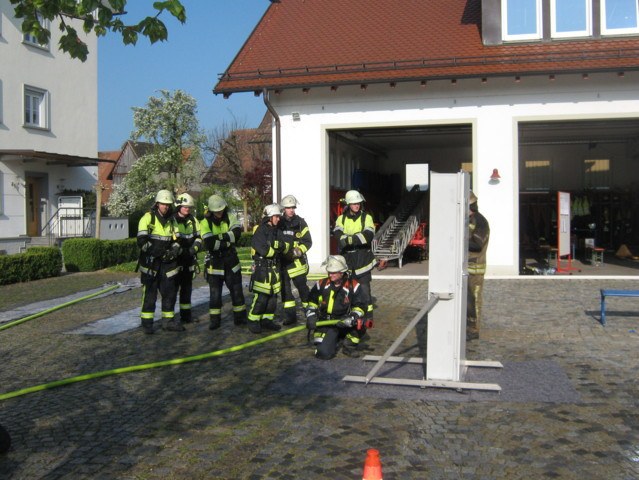 Vor dem Wasserburger Gerätehaus waren 2 Bahnen und eine Türe aufgebaut auf denen Daniel Zwahlen (Feuerwehr Saanen / Schweiz + Team brandcontainer.ch) den Umgang mit dem Strahlroh trainierte. Hier kamen auch Ausbildungsinhalte zum tragen die viele unserer Atemschutzgeräteträger schon von unseren Ausbildungen bei der Fa. Erhatec kannten, nicht zufällig waren auch alle Trainer schon bei einigen Kameraden bekannt, sind sie doch auch dort als Ausbilder tätig.