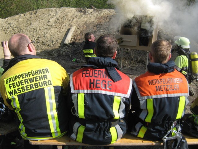 Am Samstag dann übten 32 Feuerwehrleute aus Wasserburg, Hege, Nonnenhorn, Bodolz und von der Werkfeuerwehr Metzeler ganztägig an verschiedenen Stationen den Atemschutzeinsatz. 5 externe Ausbilder aus Süddeutschland und der Schweiz unterrichteten an verschiedenen Stationen die Brandbekämpfer und vermittelten wertvolle Tipps für den Atemschutzeinsatz. So wurde durch Severin Frank von der (Feuerwehr Göppingen + Team Atemschutzunfälle) an einem Modell der Brandverlauf simuliert, der Einsatz von Lüftungsmaßnahmen demonstriert und die Chancen und Risiken dabei aufgezeigt.