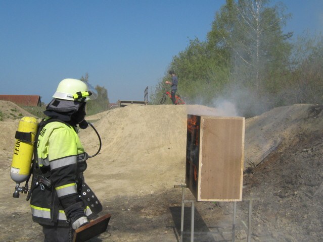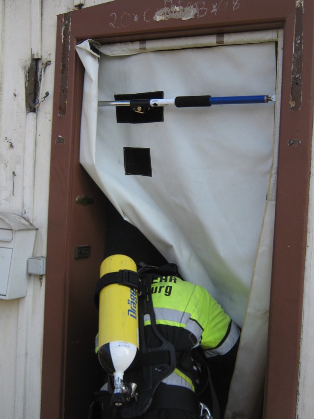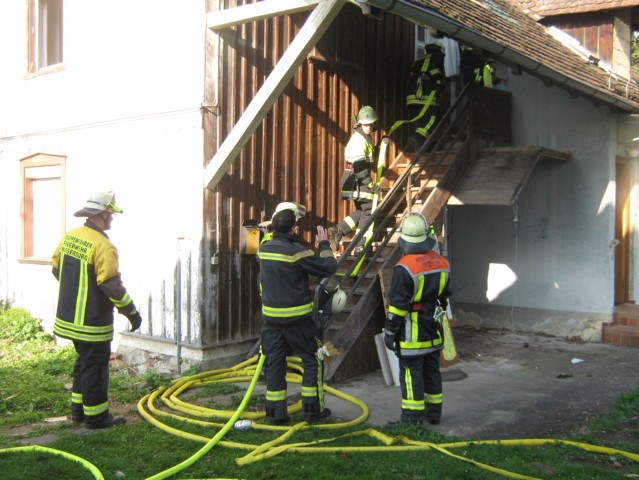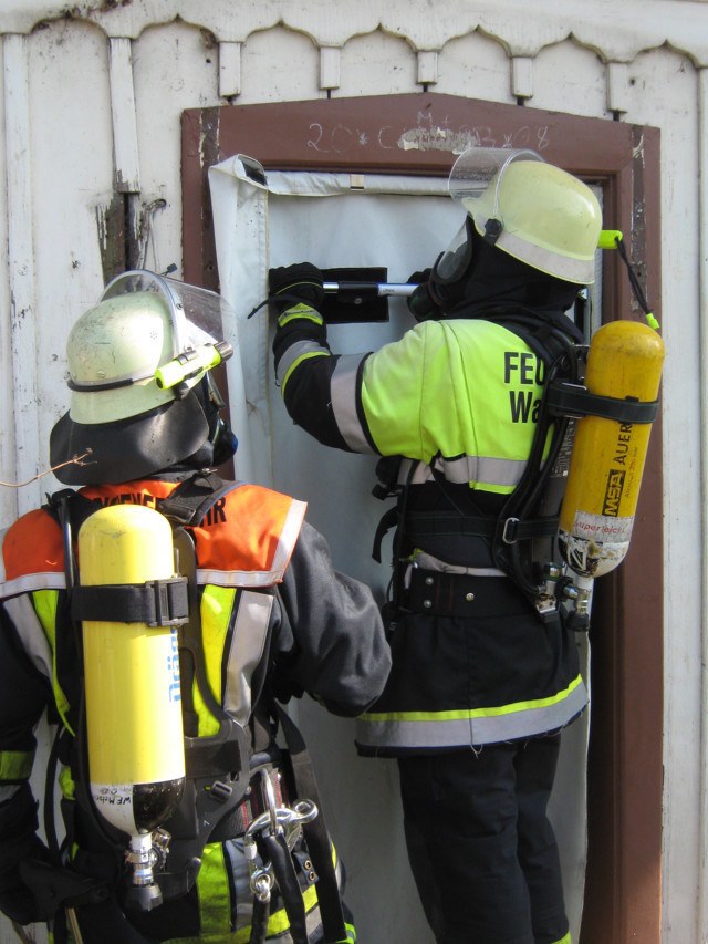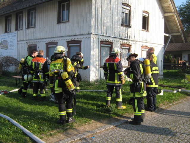 In einem der Feuerwehr Wasserburg für dieses Wochenende zur Verfügung gestellten Abbruchhaus, wofür wir uns bei den Eigentümern auch herzlich bedanken, stellten dann Volker Schmidt (Feuerwehr Illingen + Team Atemschutzunfälle) und Hans Fuhrer (Feuerwehr Aeschi / Schweiz + Team brandcontainer.ch) das gesammelte Wissen der Atemschutzgeräteträger auf die Probe. Im unteren Stock wurden die Räume realistisch vernebelt und einige Personen (Puppen) waren abgängig, diese mußten möglichst schnell gefunden und gerettet werden. Hierfür standen auch alle möglichen Hilfsmittel wie Rauchvorhang, Wärmebildkameras, Überdrucklüfter, Leinen und Schlauch zur Verfügung und wurden unter den kritischen Augen von Hans eingesetzt. Hierbei zählten vor allem Teamwork und schnelles aber durchdachtes Vorgehen. Im ersten Stock und den Treppen wurden verschieden Schlauchtechniken ausprobiert und auch für uns neue Dinge wie Schlauchpaket getestet und ausprobiert. Diese Erfahrungen waren für uns besonders wertvoll.