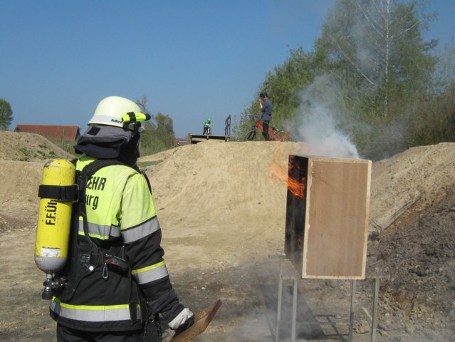 Vor dem Wasserburger Gerätehaus waren 2 Bahnen und eine Türe aufgebaut auf denen Daniel Zwahlen (Feuerwehr Saanen / Schweiz + Team brandcontainer.ch) den Umgang mit dem Strahlroh trainierte. Hier kamen auch Ausbildungsinhalte zum tragen die viele unserer Atemschutzgeräteträger schon von unseren Ausbildungen bei der Fa. Erhatec kannten, nicht zufällig waren auch alle Trainer schon bei einigen Kameraden bekannt, sind sie doch auch dort als Ausbilder tätig.