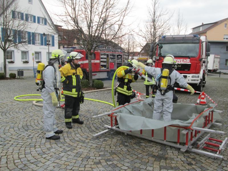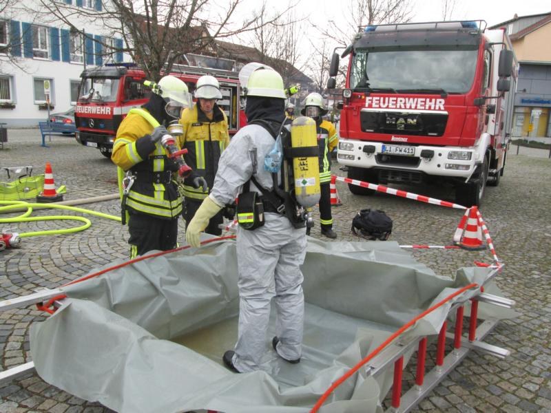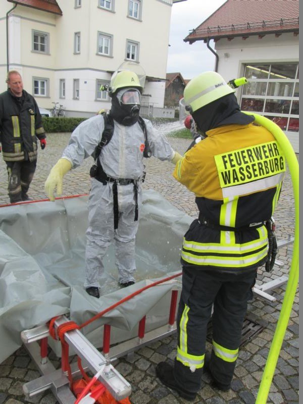 Am Samstag den 11.4. dann wurden praktische Übungen durchgeführt, neben Markus Held fungierte als externer Ausbilder Hansi Stellmacher aus Korntal-Münchingen, der den Wasserburger Feuerwehrleuten von einer Vielzahl von Veranstaltungen bereits bekannt ist. An mehreren Ausbildungsstationen wurden praktische Messungen von gasförmigen Stoffen mit Übungsmessgeräten durchgeführt, sowie das richtige an- und ablegen von Chemieschutzkleidung geübt. Nach einer Stärkung zum Mittag wurde durch 2 Löschgruppen der Feuerwehr Wasserburg eine größere Übung abgehalten bei der mehrere Personen gerettet werden mussten, die Ausbreitung einer gefährlichen Flüssigkeit gestoppt wurde und mehrere Lecks an einem Tank verschlossen wurden. Damit wäre im Ernstfall eine unmittelbare Gefahr gebannt und Spezialkräfte würden die weitere Beseitigung der Flüssigkeit übernehmen.