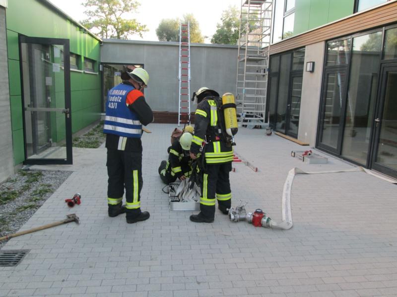 Hierbei wurde besonders Wert auf eine reibungslose Zusammenarbeit der Führungsebene gelegt, und die Einsatzkräfte konnten sich teilweise mit den neuen und weitläufigen Gegebenheiten am Objekt vertraut machen. Trotz großer Hitze wurde auch ein umfassender Innenangriff vorgetragen, hier ist besonders den Atemschutzgeräteträgern höchster Respekt für die körperliche Leistung bei diesen Witterungsbedingungen zu zollen.