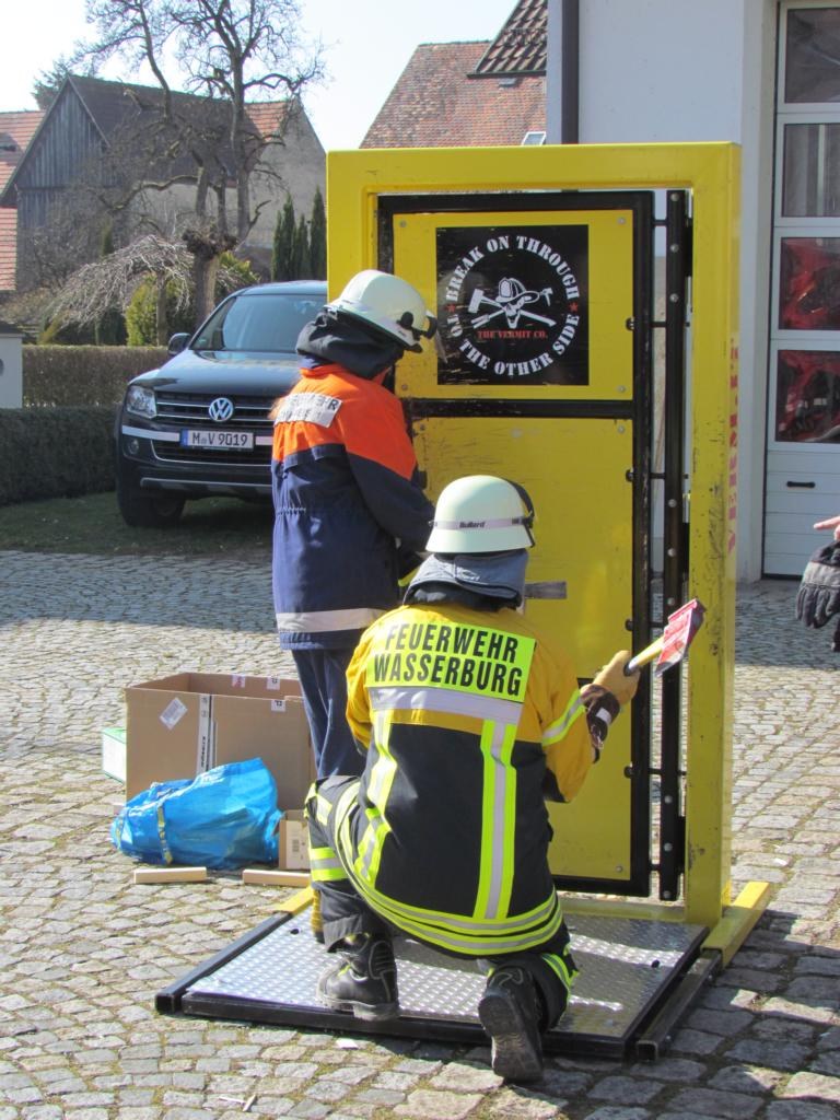 Die teilnehmenden aktiven Mitglieder der Feuerwehren Wasserburg und Hege, sowie einige Jugendliche die sich derzeit in der Grundausbildung befinden befassten sich mit Techniken zum schnellen öffnen von Fenstern und Türen. Die Feuerwehren werden immer öfter im Rahmen der Amtshilfe zu Türöffnungen für Polizei und Rettungsdienst alarmiert, aber auch bei Brandeinsätzen muß schnell ein Zugang zur betroffenen Wohnung geschaffen werden. Durch die heutzutage verwendeten Türen und Fenster die oft massiv und einbruchhemmend ausgeführt sind wird dies für die Einsatzkräfte immer schwierieger.