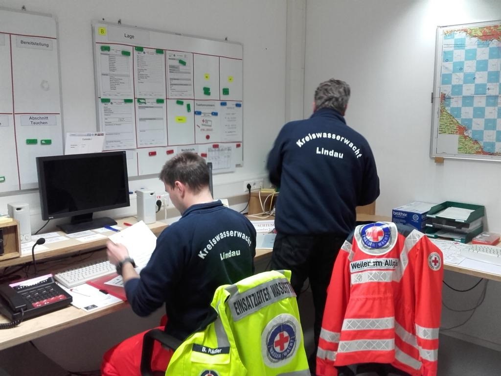 Zwei StandUp-Paddler galten bei Dunkelheit vor Wasserburg als vermisst. Unter Leitung der Wasserwacht bildete sich die gemeinsame Einsatzleitung mit den PI-Kollegen und der Feuerwehr im WSP-Gebäude, während die Boote das Planquadrat 4668 ansteuerten. Rund um das als Führungsschiff agierende Motorrettungsboot Seewolf wurde eine Suchkette gebildet. Der im Wasser treibende ausgesetzte Dummy wurde im Laufe der Übung durch das Mehrzweckboot der Feuerwehr Wasserburg gefunden und an Land verbracht. Die zweite Person konnte in der Übungsannahme ebenfalls erfolgreich an Land ausgemacht werden.