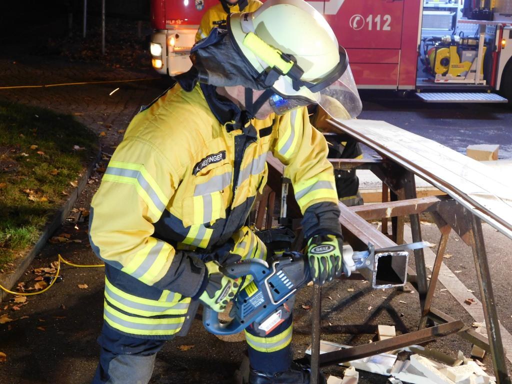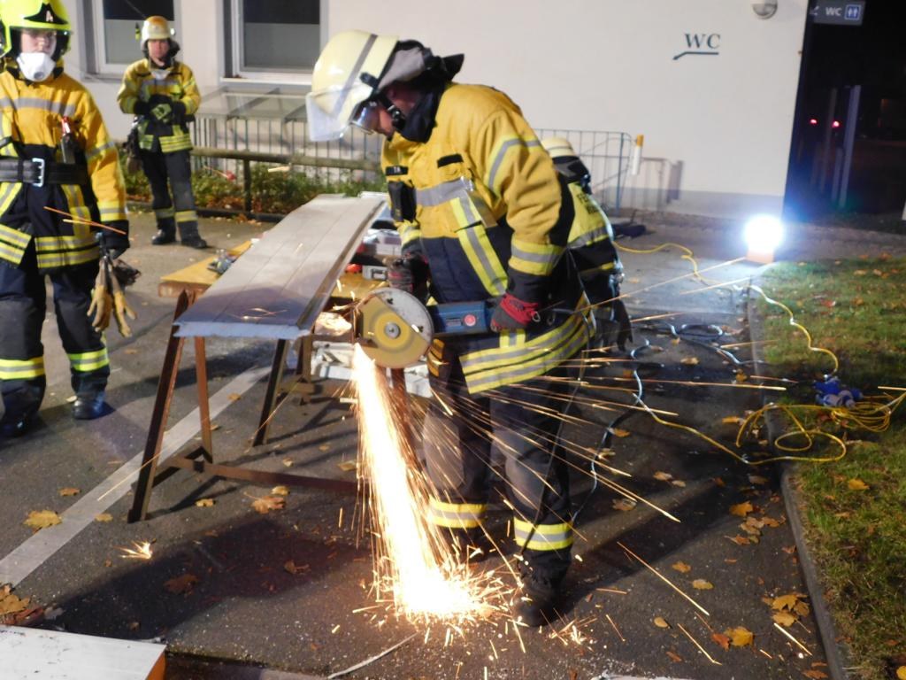 Dabei wurden mit Säbelsäge, Rettungssäge sowie kleinem und großen Trennschleifer verschiedene Materialien bearbeitet, u.a. wurde auch das schnelle herstellen von Zugangsöffnungen durch Sektionaltore und Sandwichplatten beübt.