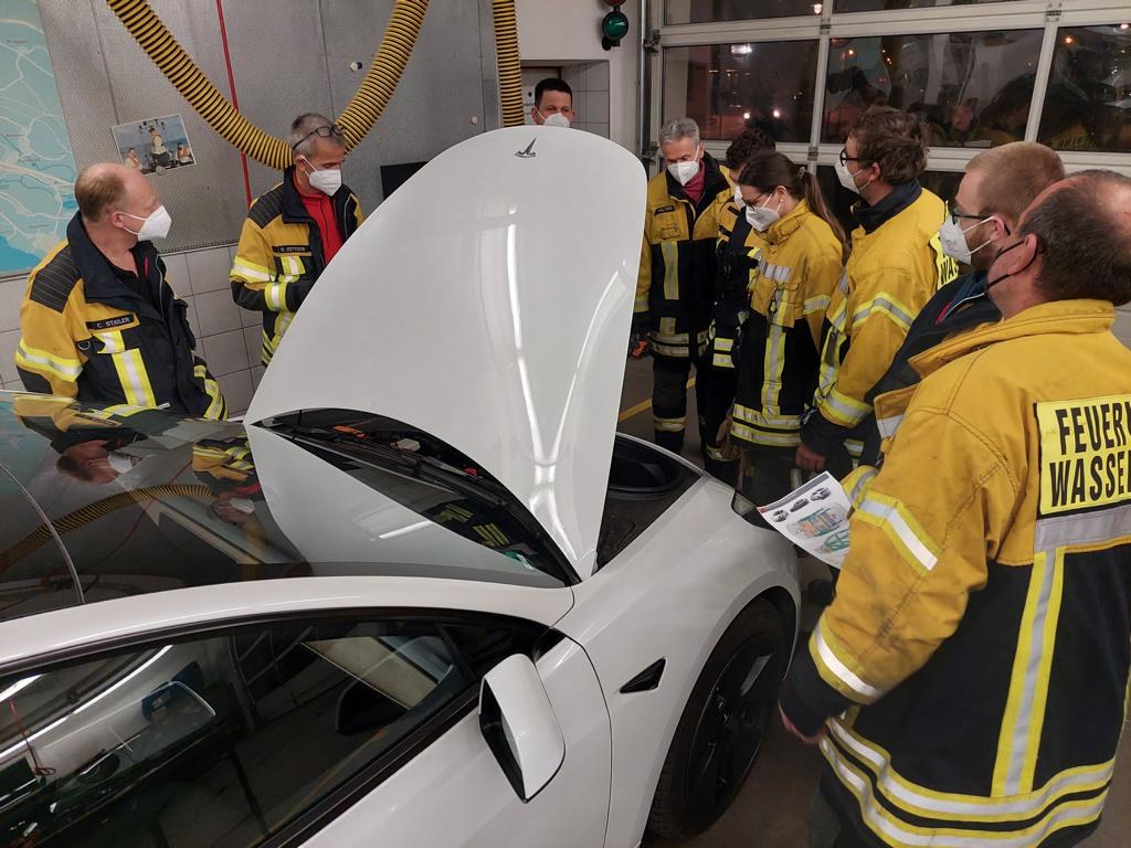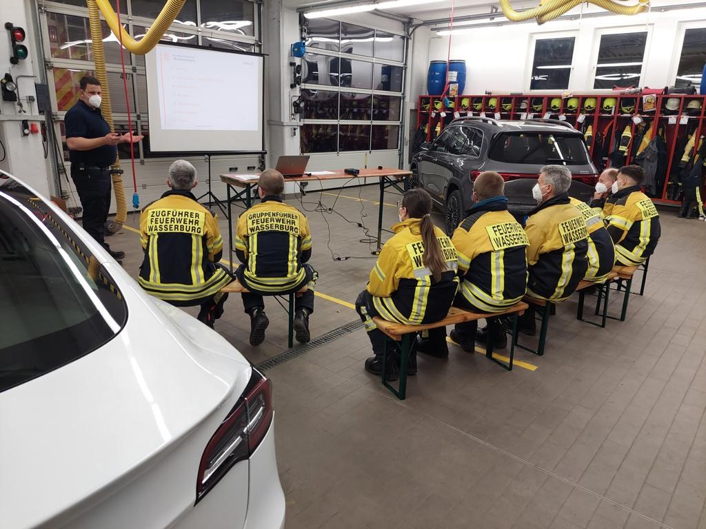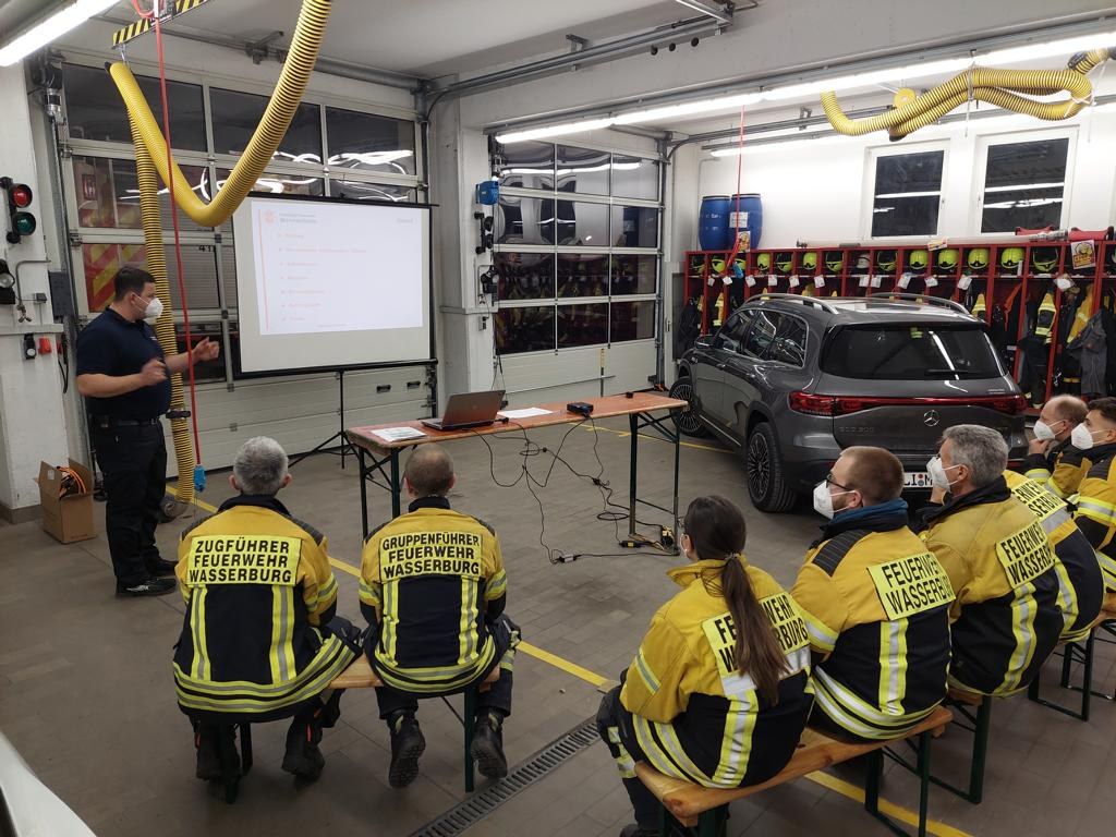 Diese kurzweilige Praxisunterweisung wurde durch Julian Schwarz, den Kommandanten unserer Nachbarfeuerwehr Nonnenhorn abgehalten. Durch Julian wurden verschiedene Antriebsarten und ihre Eigenheiten vorgestellt, und mit einigen Mythen aufgeräumt. Standardvorgehensweisen wurden besprochen, und anhand von 2 Fahrzeugen der Marken Mercedes Benz und Tesla konnten die Unterschiede auch am Objekt besichtigt werden.