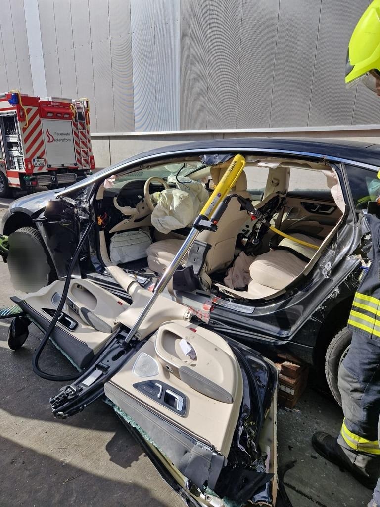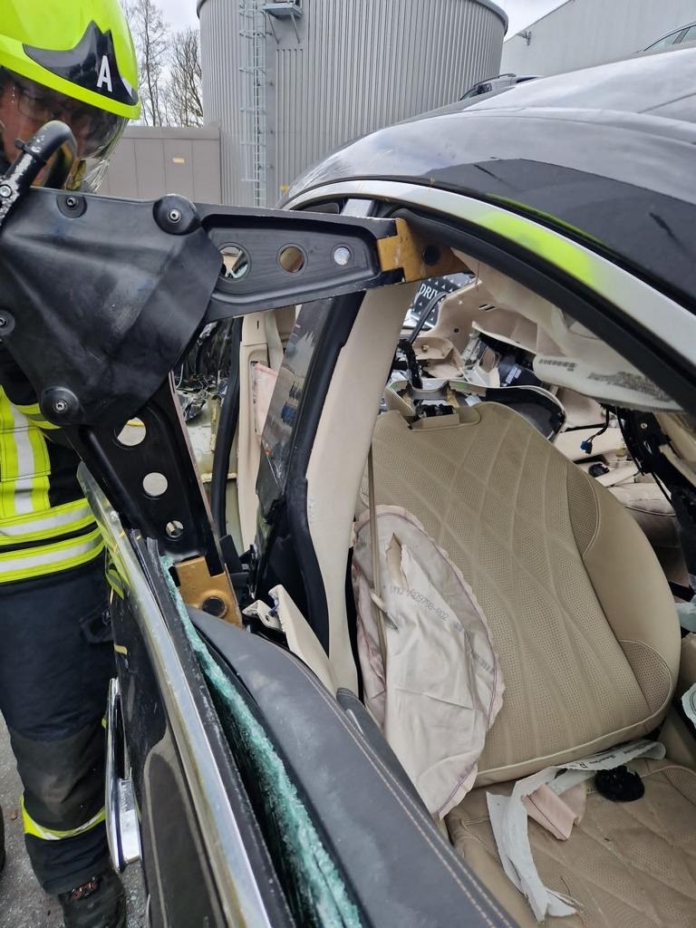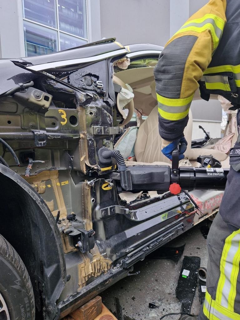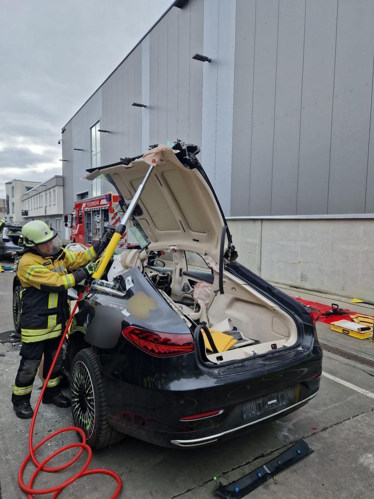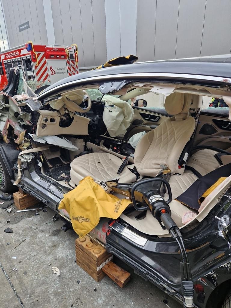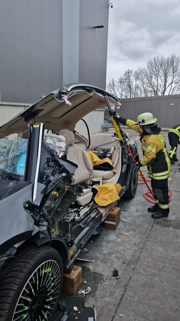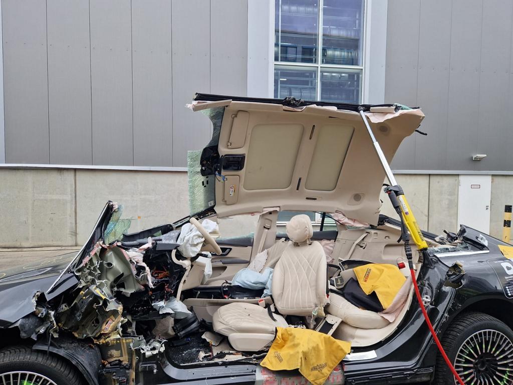 Im Anschluss wurde das Vorserienfahrzeug, ein Mercedes EQS 580 von uns geöffnet und verschiedene Methoden der Patientengerechten Rettung geübt. Hierbei wurden Mensch und Gerät an die Leistungsgrenze gebracht, und wichtige Erkentnisse für einen möglichen Einsatz konnten gewonnen werden.
