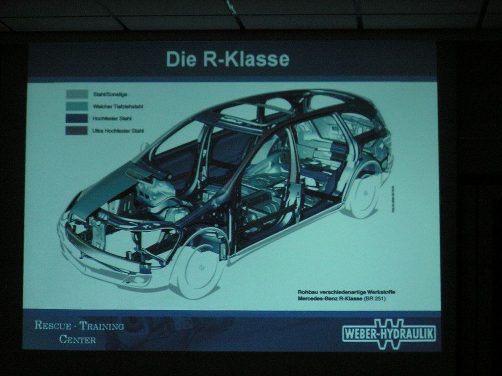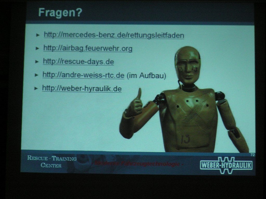 In seinem Vortrag ging Weiss auf die Problematik von Airbags, hochfesten Bauteilen und neuartigen Antriebskonzepten ein und stellte verschiedene Lösungsansätze für die Feuerwehr vor. Er wies ausdrücklich darauf hin das kein Fahrzeug mehr dem anderen gleicht und jeder Einsatz anders ist.