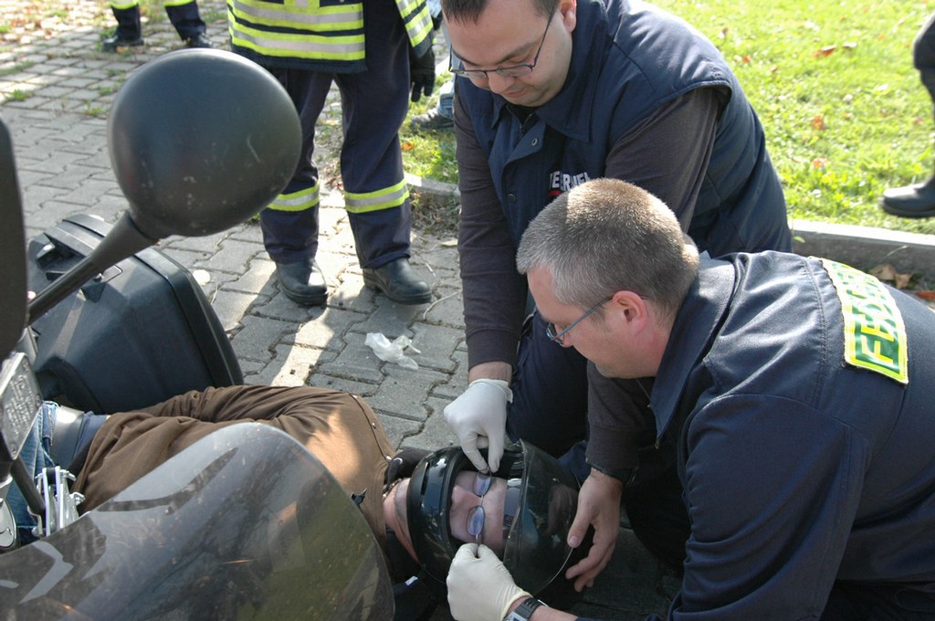 Sebastian ist mit dem Motorrad verunglückt. Der Helm muss runter. Dafür sichern Markus Schraff (Oberteuringen, links) und Josef Mäschle (Bad Urach) zuerst die Brille.