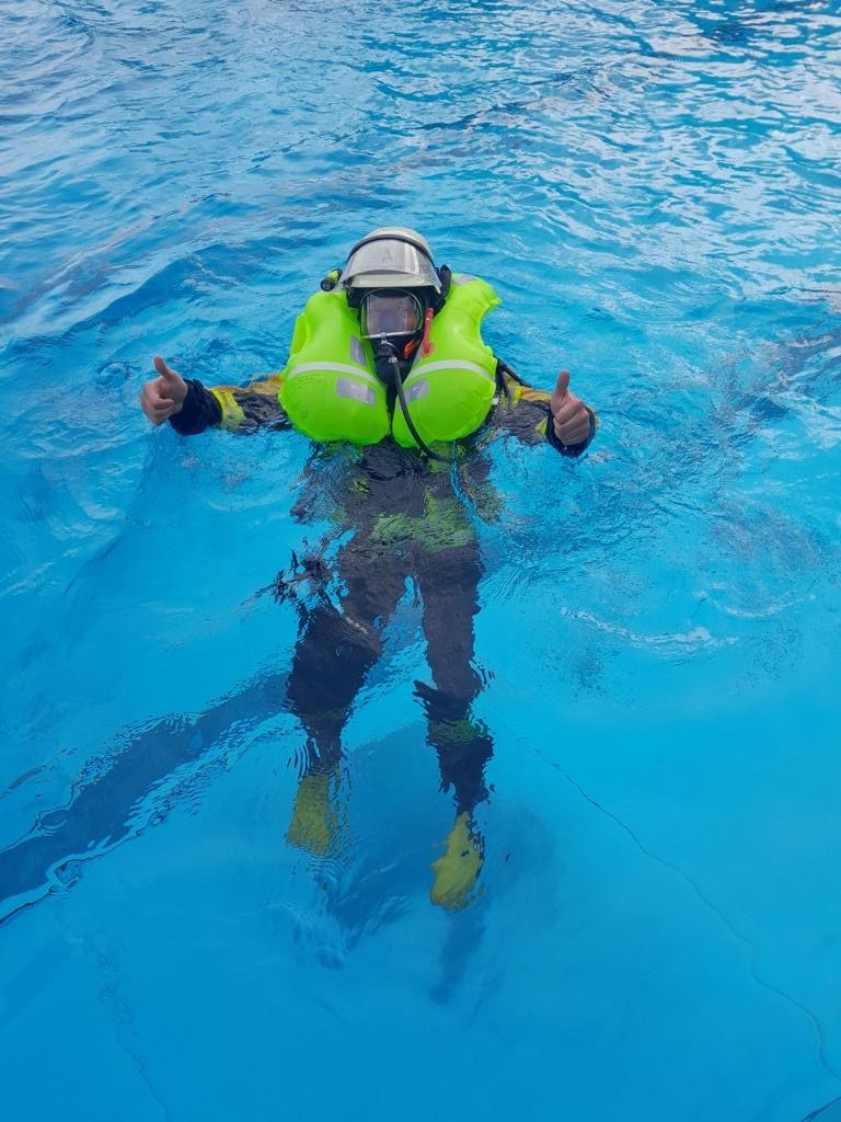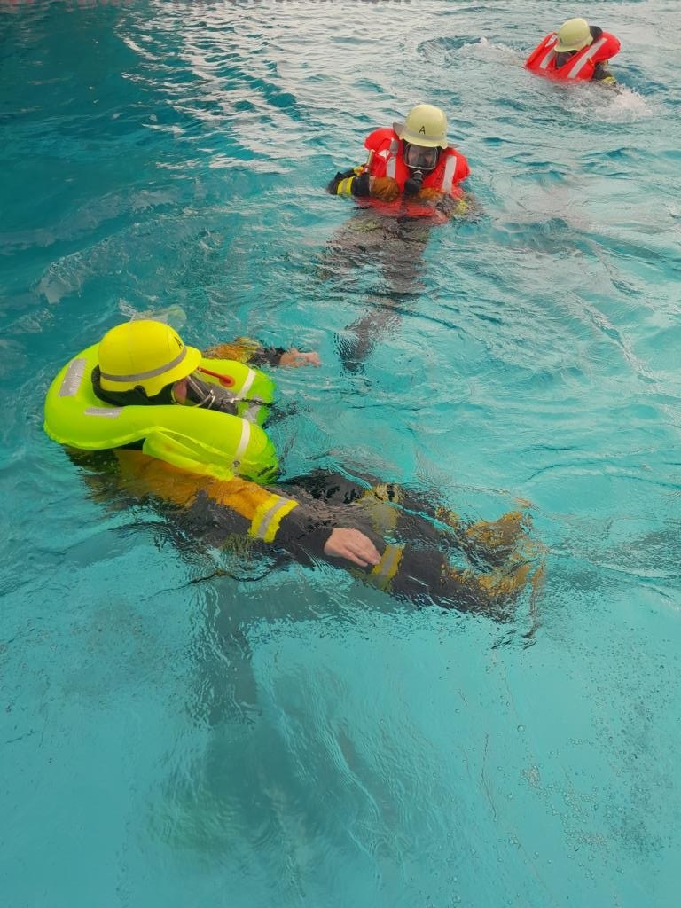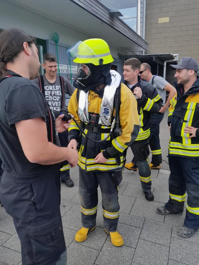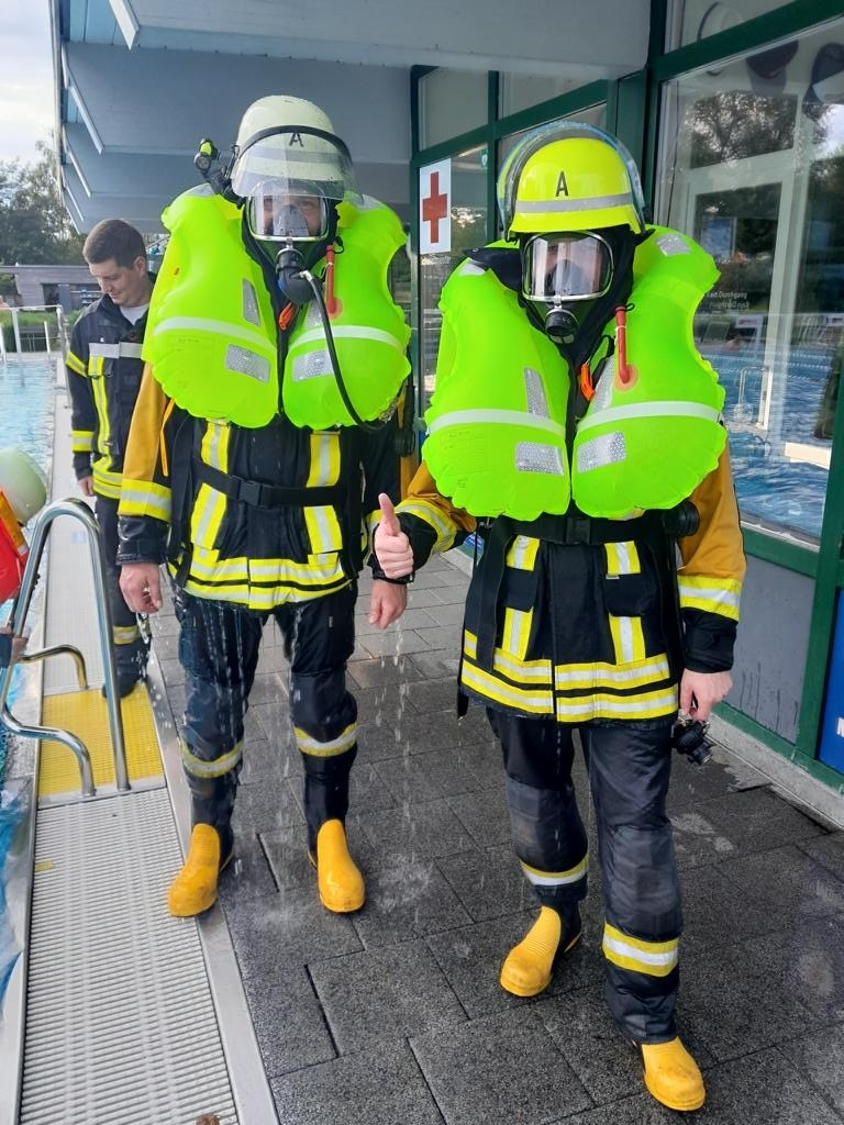 Bei Einsätzen an und auf Gewässern tragen wir zum Eigenschutz eine Schwimmweste, z.B. auch wenn wir zu einem Bootsbrand ausrücken und Atemschutz tragen. Um das Verhalten im Falle eines Falles zu beherrschen, haben wir dies wieder mit einer Gruppe beüben können. Auch die Kombination mit anderer Schutzausrüstung, wie z.B. Wathosen wurde ausprobiert, und Probleme und Grenzen erläutert und getestet.